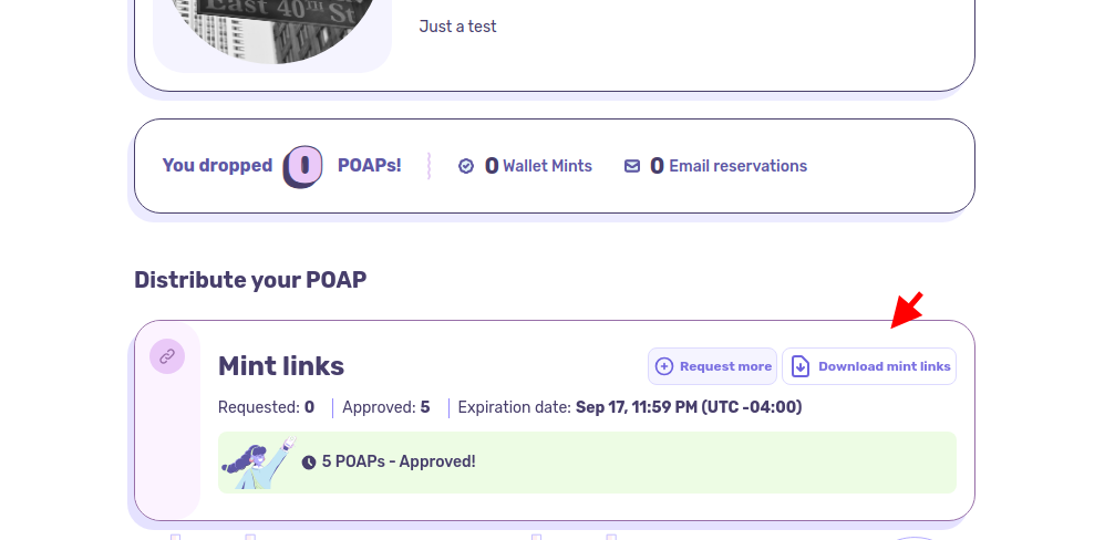 If you don’t receive the email, you can always log back into drops.poap.xyz and check the status of your POAP. You can also download the links.txt file from there.